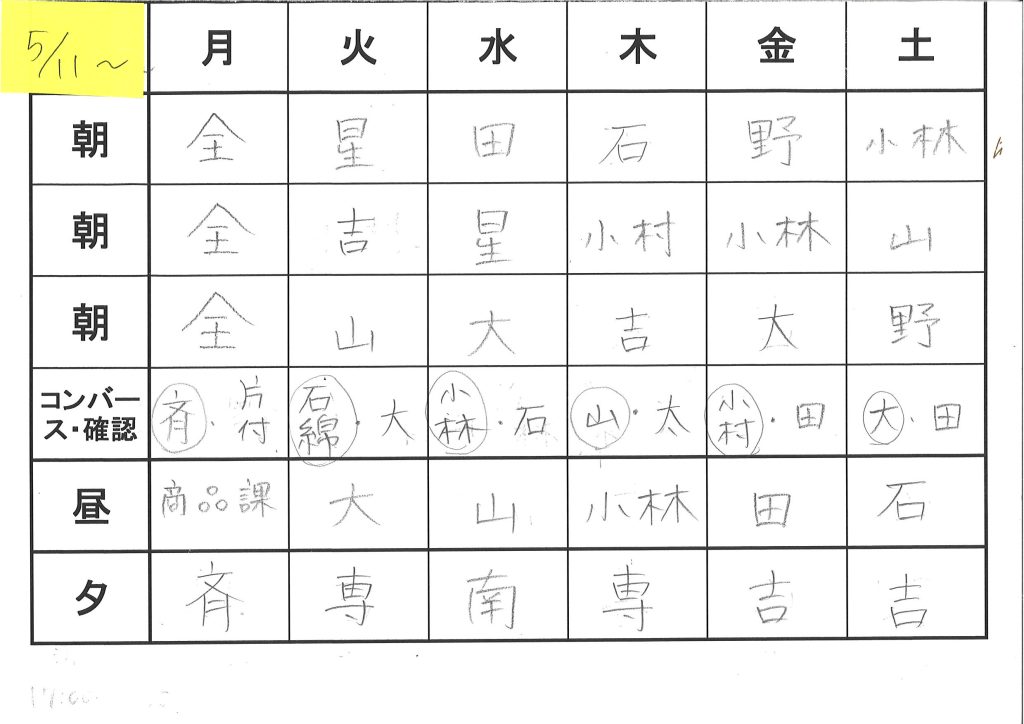 コンバースの定番チェックは朝昼夕全てにおいて試験的に廃止します。 (確認の当番が復活する場合もあるので品出し表には記載は残しておきます。)